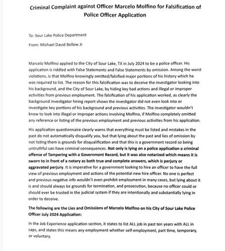 Criminal Complaint shows MARCELO MOLFINO FALSIFIED Sour Lake Police Application