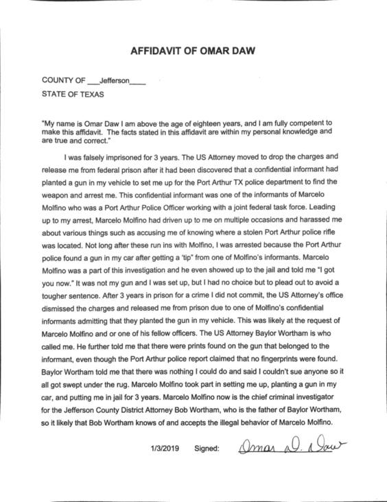 When you read this affidavit showing District Attorney investigator Marcelo Molfino's involvement in the planting of a gun on an innocent man you will wonder why he isn't in jail and why the DA Bob Wortham is protecting him!! Marcelo Molfino has been exposed in a sworn affidavit for his involvement in the framing an innocent black Port Arthur TX man, Omar Daw, with a planted gun that was put there by one of Marcelo Molfino's Informants in an effort to pad their federal task force numbers. The US Attorney dismissed the case against Omar Daw and released him from his sentence, but not before Omar Daw spent 3 years in Federal Prison. The US Attorney told Omar that the gun had been planted there and told Omar Daw that the Port Arthur Police lied about no fingerprint on the gun (there were fingerprints of only Molfino's informant) and they were sorry about the three years in jail, and then released him and told him he couldn't sue or get compensation. It was all covered up quietly. But now Omar Daw is telling his story. Marcelo Molfino was effectively banned from working with the Federal Government quietly behind the scenes, but then Bob Wortham brought him on to be the chief criminal District Attorney Investigator to protect Molfino from prosecution and to use Molfino to do his own covering up. Read the full text of Omar Daw's affidavit below and also his signed affidavit is included with this post to share and spread the word of this corruption.